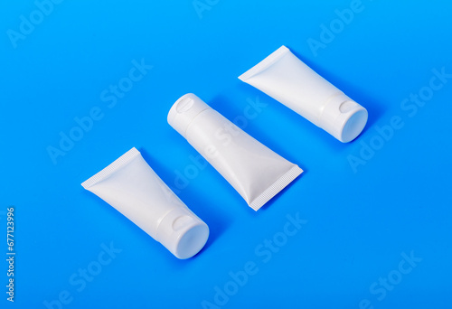 © valiantsin, Fototapeta premium Face cream, mask, scrub, gel tubes mockup row, three cosmetic product packages, blank white containers
