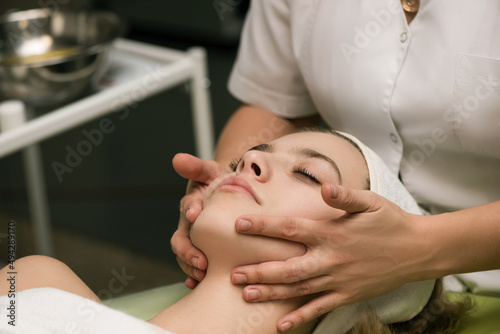 © jutaphoto, Obraz premium Face massage. Spa skin and body care. Close-up of young woman getting spa massage treatment at beauty spa salon. Facial beauty treatment