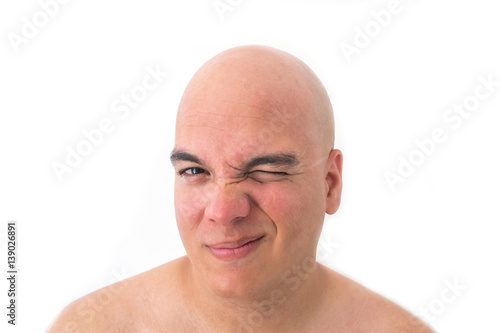 Obraz premium Face of a bald man in white background. Winking the eye.