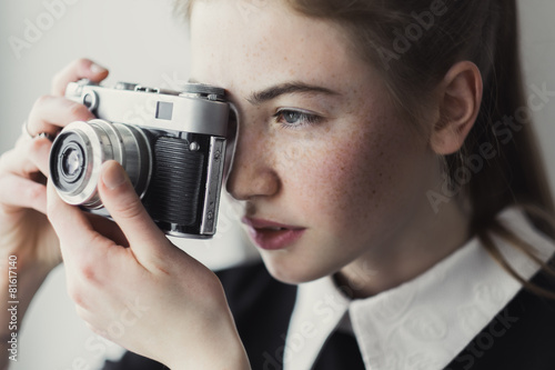Fototapeta premium face of a beautiful woman photographer and old camera