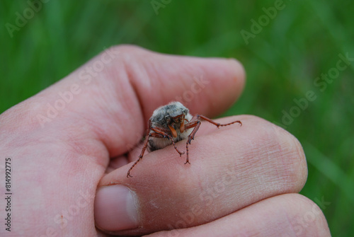 © Less Nick, Fototapeta premium face of a beetle in a human hand on a background of nature