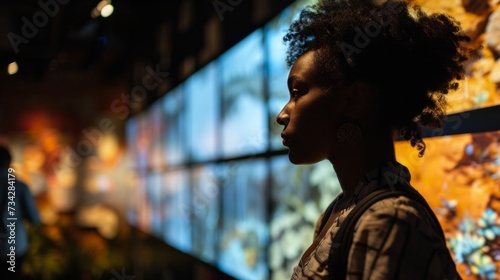 © Francheska, Fototapeta premium face of a visitor while interacting with an interactive exhibit, fusing technology and art. generative ai