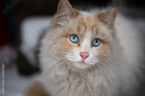 Obraz premium Face of a white fluffy cat with blue eyes close-up