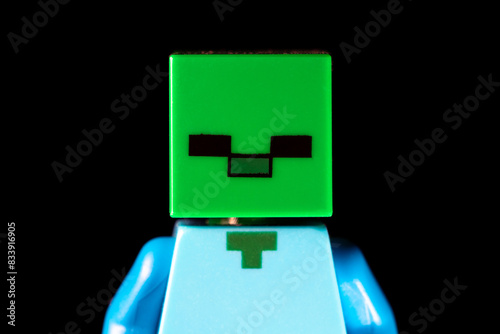 © Klochkov, Naklejka premium Face of LEGO Minecraft Zombie mob with green square face