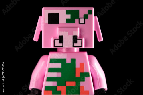 © Klochkov, Obraz premium Face of LEGO Minecraft Zombie Piglin on a black background