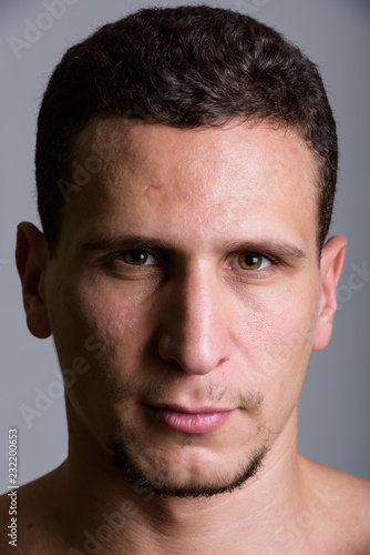 © Ranta Images, Obraz premium Face of young muscular Persian man against gray background