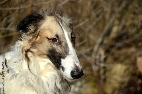 © Kim, Fototapeta premium Face portrait of a bindled borzoi with black face mask.