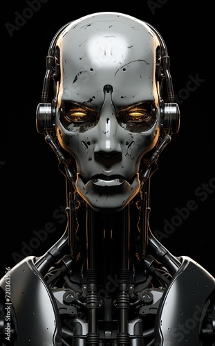 © Ольга Зуевская, Naklejka premium Face portrait of a male robot on a black background. Artificial intelligence and future technology concept. AI generated illustration.