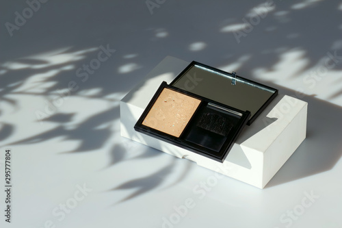 © Nataliia, Fototapeta premium Face powder in a black case. Fashion cosmetics on a white background with a shadow of leaves. Open eyeshadow, compact foundation. Concealer face powder, blush. Cosmetics with natural ingredients.