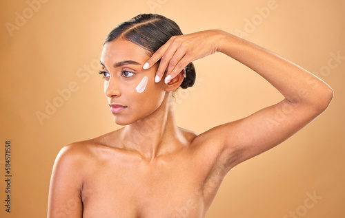 © Ilzer VH/peopleimages.com, Obraz premium Face, skincare beauty and woman with cream in studio isolated on a brown background. Dermatology idea, cosmetics and thinking Indian female model with lotion, creme or moisturizer for skin health.
