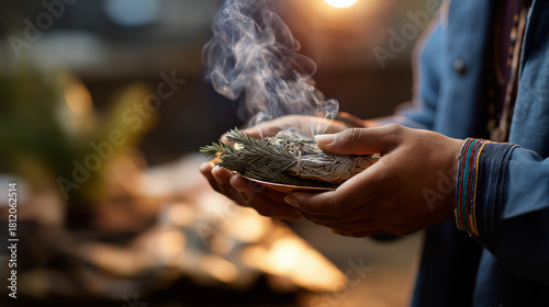 © Kateryna, Fototapeta premium Faceless shaman conducting traditional smudging ceremony defocused smoking herbs background spiritual purification ritual healing practice indigenous tradition ceremonial