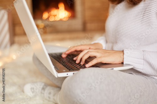 Fototapeta premium Faceless unknown woman sitting on floor on soft carpet at fireplace with laptop and working, typing, wearing white sweater and gray trousers, posing against burning fire on background.