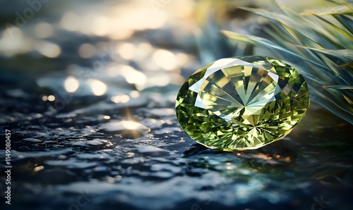 © Azril, Fototapeta premium Faceted yellow-green gem on rough surface with plant.