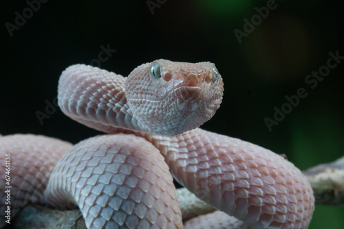 Fototapeta premium facial close up of pinkish white mangrove pit viper snake, trimeresurus...