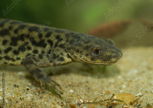 © Henk, Naklejka premium Facial closeup on the rare and protected African ribbed newt, Pleurodeles nebulosus, under water