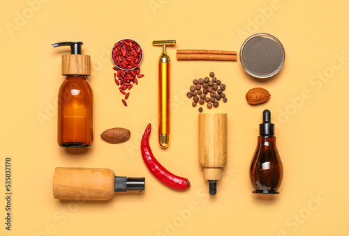 Naklejka premium Facial massage tool with cosmetic products and natural components on beige...