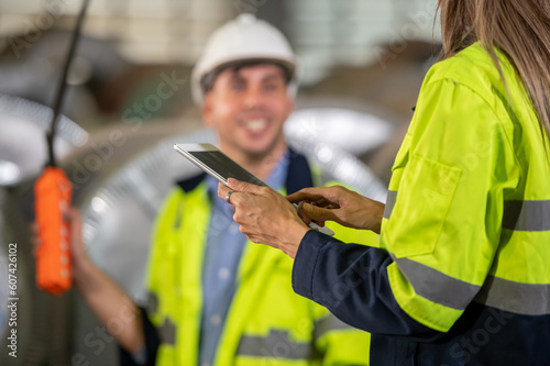 © BESTIMAGE, Obraz premium Factory apprenticeship. Woman mentor teaching man employee trainee operating machine look monitors and hand press control button process machinery. Leader foreman explaining engineer control machine