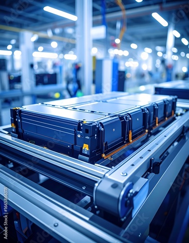 © Fany, Obraz premium Factory assembly line showcasing large rectangular battery modules on a conveyor belt