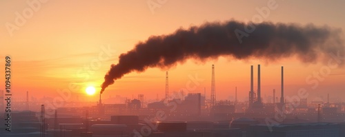 Naklejka premium Factory emitting black smoke against sunset, industrial pollution, symbolizing human environmental footprint