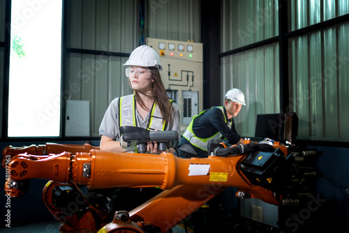 Fototapeta premium Factory engineers inspecting on machine with smart tablet. Worker works at heavy machine robot arm. The welding machine with a remote system in an industrial factory. Artificial intelligence concept.