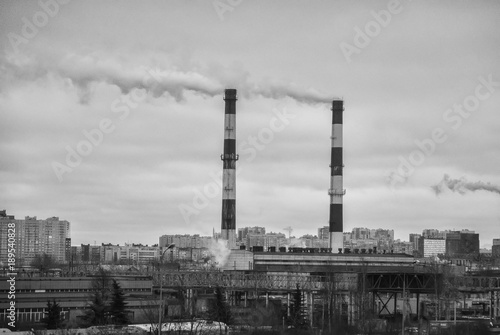 Obraz premium Factory in the city. Environmental pollution threat. Black and white.