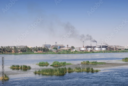 © Claudio Caridi, Fototapeta premium Factory on the Nile river shore, southern Egypt, Africa. Cruising on Nile River.