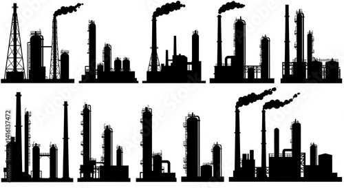 © nurjan100, Fototapeta premium Factory, power plant industrial icons. Factory, power plant, oil refinery and oil processing plant industrial icon.