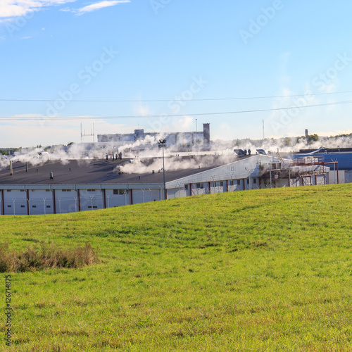 Obraz premium Factory production buildings roof with steam