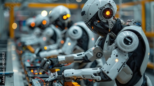 © thekob5123, Fototapeta premium Factory robot workers in helmets and gloves operating advanced robotics on a high-tech assembly line, focused on precision manufacturing, modern industrial environment