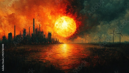 Obraz premium Factory Sunset with Windmills