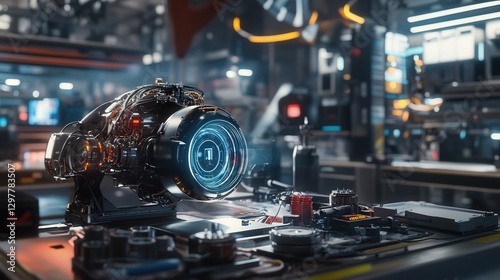 © Athirat, Fototapeta premium factory where an engineer uses an AR headset to visualize a holographic engine model, offering insights into advanced digital
