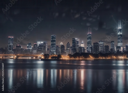 © OneWayPhoto, Fototapeta premium Faded film photo with light leak effect showing cityscape at night, cityscape, light leaks