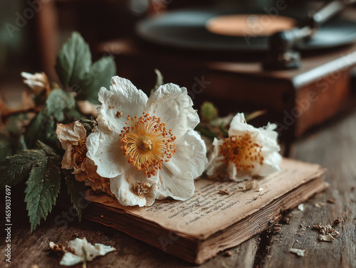 © Clint, Fototapeta premium Faded Flowers and Old Book on a Table