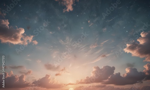 © Teddy, Naklejka premium Faded retro sky, distressed paper texture, wispy clouds, twinkling stars , cosmos, celestial, aged