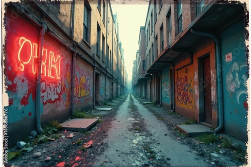 © nittiya, Fototapeta premium Faded, scratched polaroid photo of urban decay scene, texture, street, image