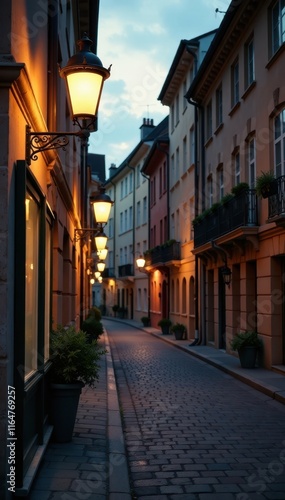 Fototapeta premium Faded sign and vintage lamp post on historic European street at dusk, brick, urban