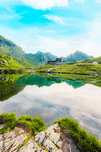 © Zedspider, Fototapeta premium Fagaras mountains with Balea lake on Transfagarasan serpentine road in Sibiu County, Romania.