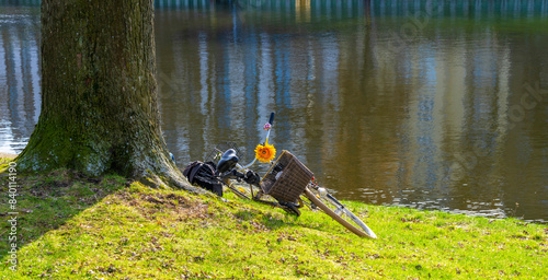 © spuno, Naklejka premium Fahrrad liegt am Ufer der Spree, Berlin, Deutschland