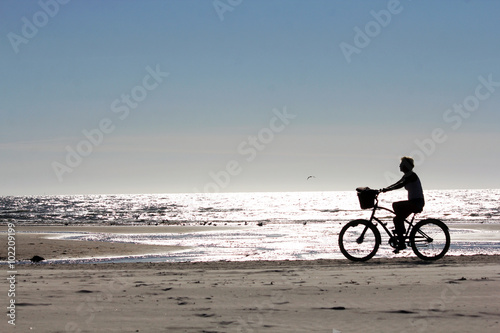 Fototapeta premium Fahrradfahrerin am Strand Rømø