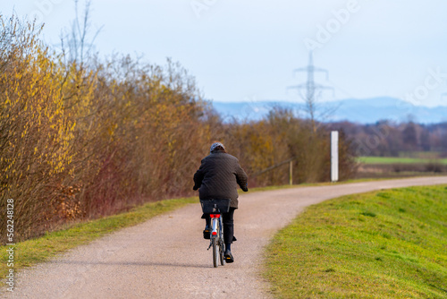 Fototapeta premium Fahrradfahrerin auf eine Damm an der Donau