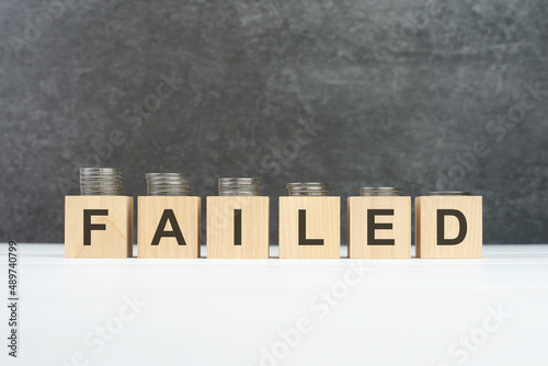 © Maks_Lab, Naklejka premium failed word, text written on wooden cubes on a black background with coins on cubes