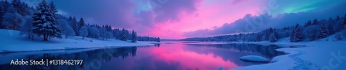 © Patthama, Fototapeta premium Faint pink glow of aurora borealis illuminates icy lake, peaceful atmosphere, winter wonderland