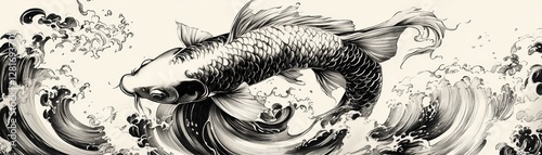Obraz premium Faintly inked koi fish gliding through swirling Japanese waves, symbolizing...