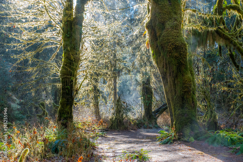 Fototapeta premium Fairy forest is filled with old temperate trees covered in green and brown mosses. Hoh Rain Forest, Olympic National Park, Washington state, USA