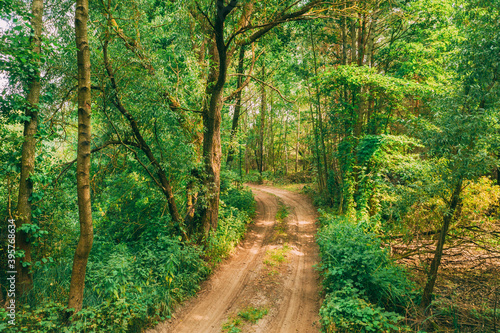 Obraz premium Fairy Forest Lane Road Way Path Through Summer Green Deciduous Forest. European Nature