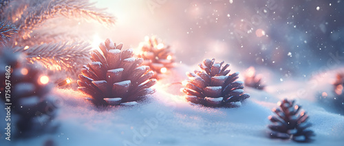 © Nim, Fototapeta premium Fairy-light snow background with pine cones and lights. Christmas or New Year banner, greeting card design.