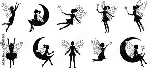 © Creative Asif, Naklejka premium Fairy, silhouette, wings, magic, wand, moon, flying, sitting, fantasy, enchanted, mystical, cartoon, illustration, pose, black, whimsical, star, night, magical, design