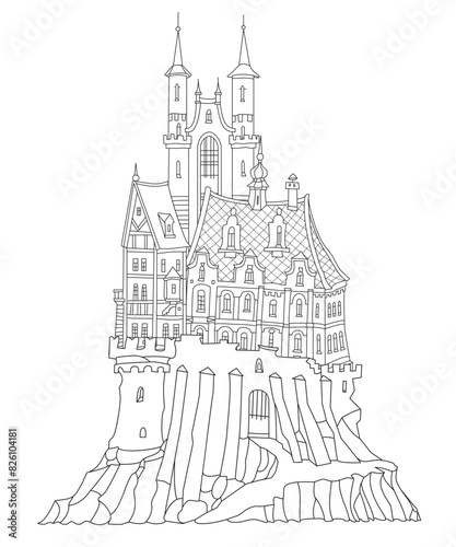 Fototapeta premium Fairy tale castle fortress. Hand drawn black and white architectural sketch for coloring book page