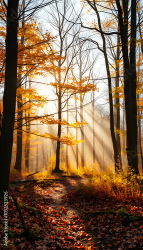 Fototapeta premium Fairy tale spring in autumn forest. Morning rays of light through the trees....