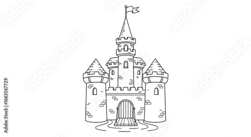 Fototapeta premium Fairytale castle line art with towers battlements and a flag on a central spire.